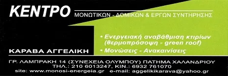 Η εταιρεία Κέντρο Μονωτικών Δομικών & Έργων Συντήρησης - Αγγελική Καραβά ασχολείται από το 1985 με μονωτικές εργασίες. Η εταιρεία μας συνεργάζεται στενά με κατασκευαστικές εταιρείες όπως η ΣΤΕΨΙΣ ΑΤΕ, Core Construction, Stelios Vakirtzis & Architects, παλαιότερα με την Θέμις Κατασκευαστική, καθώς και με μελετητικά γραφεία όπως το Kizi Studio, Alias Architects, Πολυάννα Παρασκευά & Συνεργάτες, Μαλαμάκης Ιωάννης, Τζώρτζης Ιωάννης. Έχοντας κατασκευάσει δεκάδες έργα ιδιωτικά και δημόσια έχουμε την τεχνογνωσία και το κύρος να αναλάβουμε οποιοδήποτε έργο μας ανατεθεί με γνώμονα την υψηλή αντοχή, τις καινοτόμους μεθόδους και την υψηλών προδιαγραφών επιλογή των υλικών. Η ομάδα μας αποτελείται από έμπειρους και εξειδικευμένους τεχνίτες σε συνεργασία με Μηχανικούς, Αρχιτέκτονες, Μηχανολόγους. Στην πορεία των χρόνων, η εταιρία μας έχει πραγματοποιήσει επίσης πλήθος ιδιωτικών έργων (πολυκατοικίες, κατοικίες) στην ευρύτερη περιοχή των Αθηνών