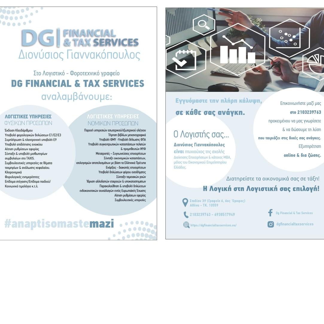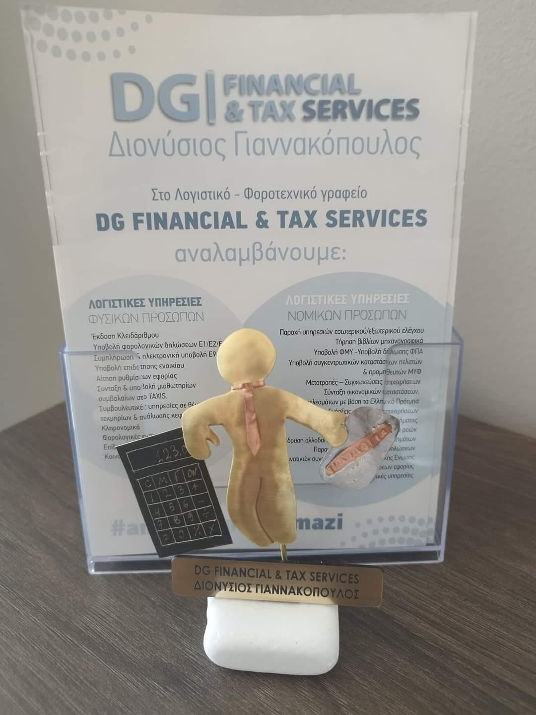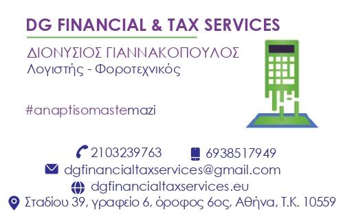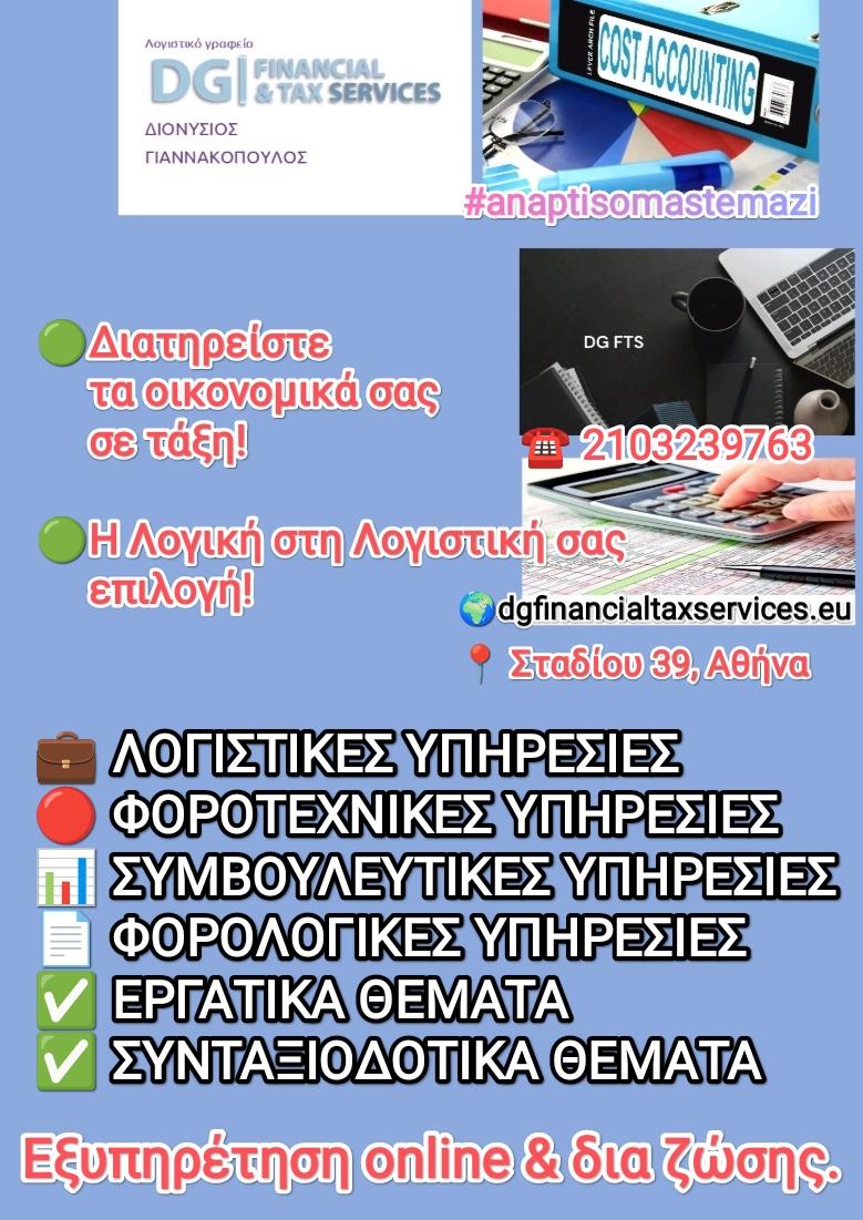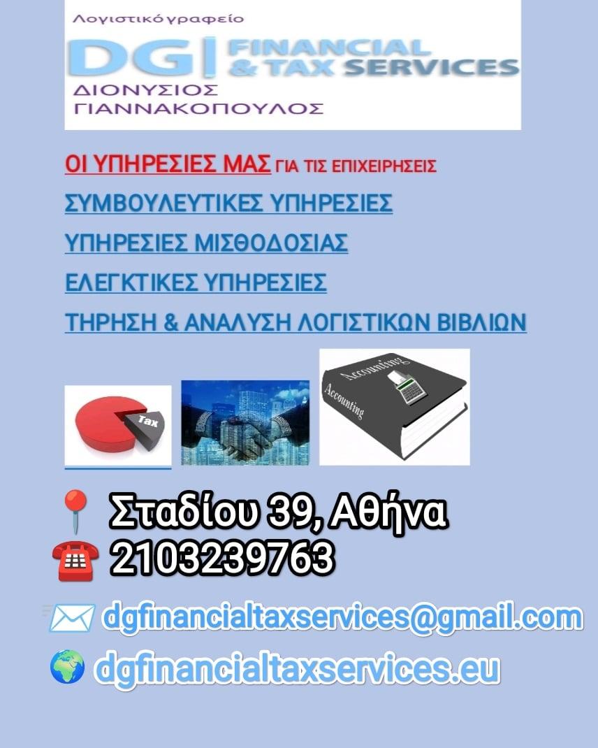 Το Λογιστικό γραφείο DG FINANCIAL & TAX SERVICES του Διονύσιου Γιαννακόπουλου λειτουργεί στη καρδιά της Αθήνας επί της οδού Σταδίου 39, υποστηρίζει επιχειρήσεις κάθε είδους καθ' όλη τη διάρκεια της οικονομικής τους ζωής,σε κάθε στάδιο.Ο ιδιώτης Φορολογούμενος νιώθει ασφαλής με τις φορολογικές του υποχρεώσεις μαζί μας χάρις στις προτάσεις&τις τεκμηριωμένες λύσεις που του παρέχουμε. To γραφείο μας δραστηριοποιείται στη παροχή φοροτεχνικών,λογιστικών,συμβουλευτικών&χρηματοοικονομικών υπηρεσιών, με σκοπό την ολοκληρωμένη υποστήριξη των σύγχρονων επιχειρήσεων και οργανισμών.Η DG FINANCIAL & TAX SERVICES - ΔΙΟΝΥΣΙΟΣ ΓΙΑΝΝΑΚΟΠΟΥΛΟΣ αναλαμβάνει την πλήρη διεκπεραίωση της διαδικασίας έκδοσης απόφασης σύνταξης με όλες τις απαραίτητες ενέργειες από την κατάθεση της αίτησης για απονομή σύνταξης στον αρμόδιο ασφαλιστικό φορέα μέχρι την άμεση έκδοση της.Σύνταξη γήρατος,χηρείας, αναπηρική σύνταξη.Επικοινωνήστε μαζί μας στο 2103239763&θα βρείτε τις λύσεις που ταιριάζουν στις δικές σας ανάγκες.