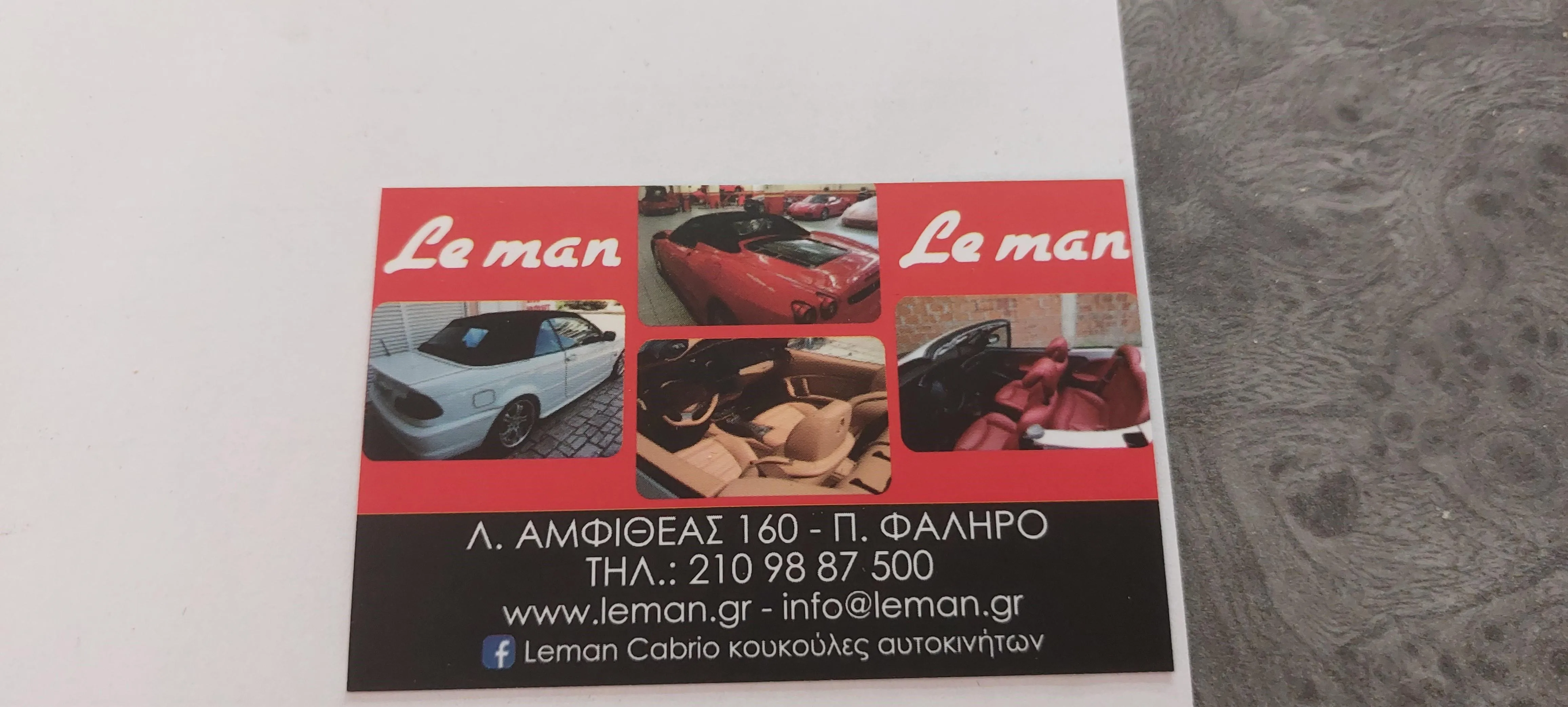 Η εταιρεία Le man βρίσκεται στο χώρο των ειδών αυτοκινήτου δυναμικά από το 1978.Η μεγάλη μας πείρα εγγυάται την αξιοπιστία και την ποιότητα των εργασιών μας. Με εξειδίκευση στις κουκούλες των cabrio αυτοκινήτων έχουμε την δυνατότητα να διορθώσουμε, να επισκευάσουμε και να αντικαταστήσουμε μέρος αλλά και ολόκληρη την κουκούλα του αυτοκινήτου σας με υλικά και αναλώσιμα των καλύτερων εργοστασίων της Ευρώπης και της Αμερικής. Εισάγουμε τα καλύτερα και τα πιο ανθεκτικά υφάσματα και υλικά για να ικανοποιήσουμε και τους πιο απαιτητικούς πελάτες μας.Είμαστε μοναδικοί για πολλές εφαρμογές και λύσεις που άλλες εταιρίες δεν μπορούν να προσφέρουν. Πάντα με γνώμονα την ποιότητα και την αποφυγή περιττών εξόδων.Έχουμε την δυνατότητα να επισκευάσουμε μέρος της κουκούλας αλλά και της ταπετσαρίας του αυτοκινήτου σας Εργασίες:Συγκολήσεις τζαμιών σε Audi A3,A4,A5,TT,VW Beetle Μερική επισκευή κουκούλας από παραβίαση η ατύχημα.Αντικατάσταση κουκούλας με νέα από γερμανικό καμβά.Αντικατάσταση ζελατίνας
