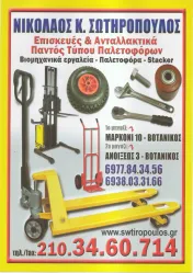 Η εμπειρία και γνώσης μας, επιτρέπουν τη λύση οποιουδήποτε προβλήματος σε θέματα ανύψωσης και διακίνησης εμπορευμάτων. Στην εταιρεία μας θα βρείτε: Παλετοφόρα - Ανυψωτικά - Ρόδες - Καρότσια Χειρός -Επισκευές.Η εταιρεία μας εκτός από εισαγωγή και πώληση, ασχολείται και με την επισκευή παλετοφόρων, stacker, reach stacker, κλάρκ, ηλεκτρικών παλετοφόρων και χειραμαξών.Για μας είναι σημαντικό όχι μόνο να σας πουλήσουμε αξιόπιστο προϊόν αλλά και να σας υποστηρίξουμε μετά την πώληση, γι' αυτό διαθέτουμε αξιόπιστα και γνήσια ανταλλακτικά για κάθε είδος χειροκίνητου παλετοφόρου-ηλεκτρικού παλετοφόρου - ανυψωτικού (stacker) καθώς και αναλαμβάνουμε τη τοποθέτηση των εκάστοτε ανταλλακτικών στο μηχάνημα σας.Η επισκευή γίνεται όσο το δυνατόν γρηγορότερα και ο μέσος χρόνος παραμονής του παλετοφόρου στην εταιρεία μας είναι 1,5 ώρα. Τα ανταλλακτικά που χρησιμοποιούμε είναι τα ΕΓΓΥΗΜΕΝΑ ΓΝΗΣΙΑ για το εκάστοτε μηχάνημα και υψηλών προδιαγραφών.