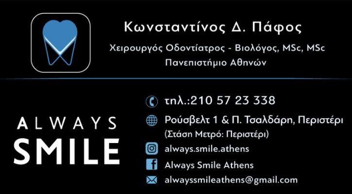 Παρέχεται εξατομικευμένη οδοντιατρική φροντίδα, σύμφωνα με τα νεότερα θεραπευτικά πρωτόκολλα, προσαρμοσμένα στις ανάγκες κάθε ασθενούς. Χρήση εξοπλισμού τελευταίας τεχνολογίας. Ο οδοντίατρος κ. Κωνστάντινος Δ. Πάφος είναι απόφοιτος της Οδοντιατρικής Σχολής του Εθνικού και Καποδιστριακού Πανεπιστημίου Αθηνών. Παράλληλα είναι κάτοχος πτυχίου Βιολογίας του πανεπιστημίου Αθηνών καθώς και 2 μεταπτυχιακών τιίτλων από την Ιατρική Σχολή του Πανεπιστημίου Αθηνών. https://www.facebook.com/alwayssmileath/