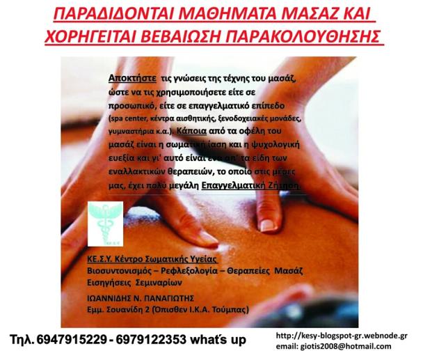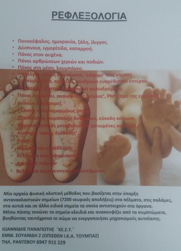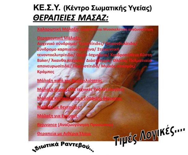 Το ΚΕ.Σ.Υ. (Κέντρο Σωματικής Υγείας) είναι ένα σύγχρονο κέντρο στην Α. Τούμπα Θεσσαλονίκης που προσφέρει υπηρεσίες Χειρονακτικού Μασάζ (Χαλαρωτικό, Αθλητικό, Θεραπευτικό, Βεντούζες, Αντικυτταριτιδικο, lifting Προσώπου, Μασάζ για εγκύους, Για βρέφη & παιδιά κ.α.), Ρεφλεξολογίας και Βίο-συντονισμού. Ιδιοκτήτης του Κέντρου είναι ο Ιωαννίδης Παναγιώτης Πτυχιούχος Θεραπευτής Μάλαξης & Ρεφλεξολογίας από την Παγκόσμια Ομοσπονδία Μασάζ, Πιστοποιημένος Χειριστής ΒιοΕνεργειακών Συσκευών καθώς και Εισηγητής Επιμορφωτικών Σεμιναρίων Μασάζ σε Συλλογικό και Ατομικό(ιδιαίτερα) επίπεδο