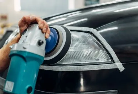 Ξεθάμπωμα των μπροστινών φαναριών του αυτοκινήτου με χρήση ειδικών αλοιφών για πλήρη ορατότητα και ασφάλεια.
